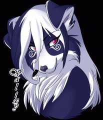 Волчица с серо-голубыми глазами и чёрно-синей шерстью с белым и белыми узорами.
